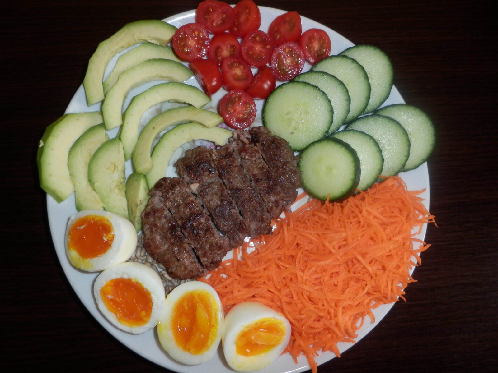 Salada: cenoura ralada, pepino biológico, tomatinhos, meio abacate, 2 ovos cozidos e 2 hambúrgueres ( comprar a carne picada, fazer o formato de hambúrguer, temperar com sal e pimenta preta e grelhar)
