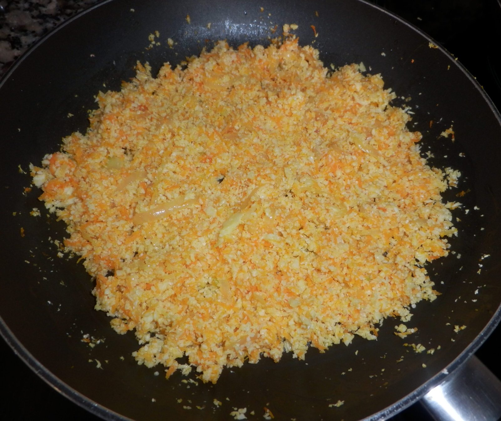 4. Numa frigideira, colocar o azeite e a cebola às rodelas. Quando esta estiver a ficar dourada, juntar a cenoura ralada, uma pitada de sal e os temperos a seu gosto. Deixar cozinhar cerca de 2 minutos.