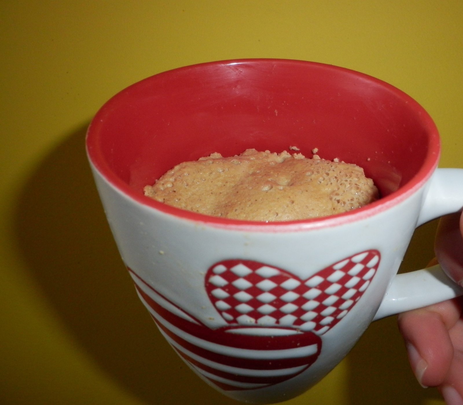 3. Levar ao micro-ondas numa caneca. Eu coloquei 2 minutos, porém como ainda estava um pouco líquido, coloquei mais 1 minuto. Se querem mais líquido, deixem pouco tempo. Se querem que fique mais seco, coloquem mais minutos. Em alternativa, se não for adepto de micro-ondas: Verter em forminhas de queques (forradas previamente com papel vegetal) e levar ao forno até ficar com textura a gosto.
