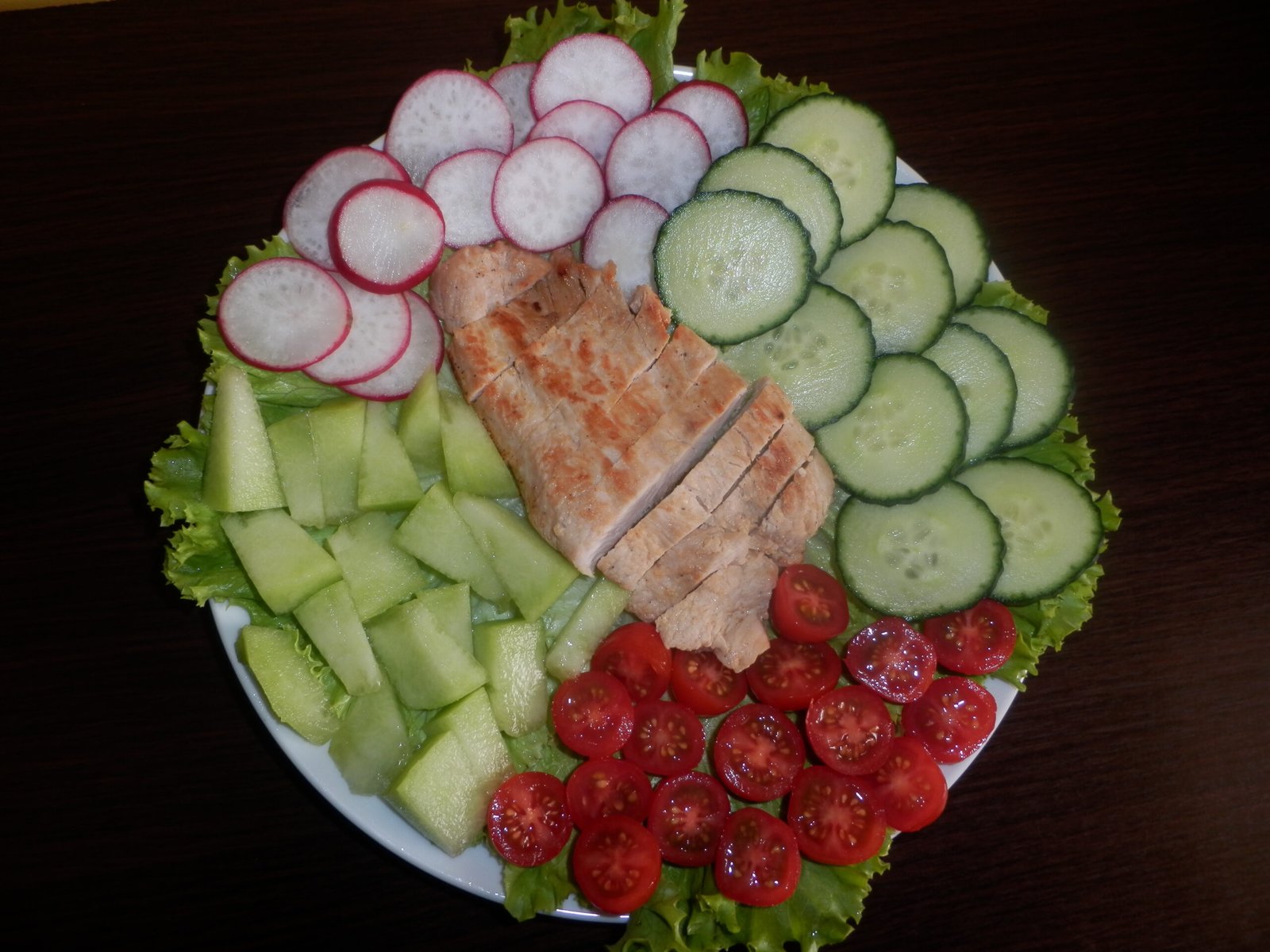 Salada: alface, peito de frango, rabanetes, pepino biológico, tomates-cereja e 1 fatia de melão. Salada temperada com azeite extra virgem e vinagre de coco.
