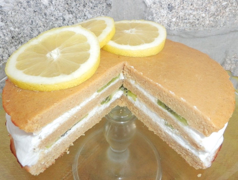 Bolo de Limão fofo com Chantilly de Coco e Kiwi. Ver a Receita, clicando AQUI.