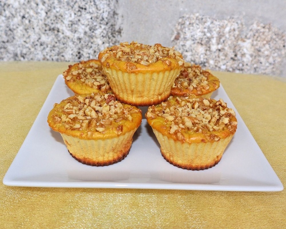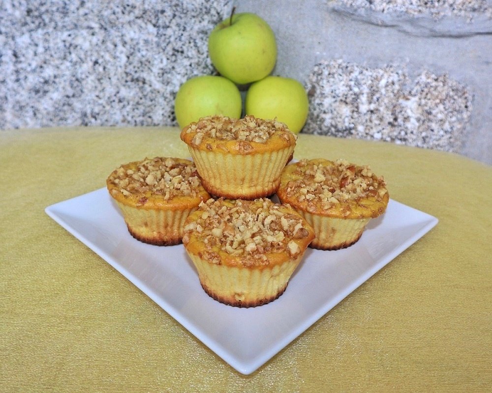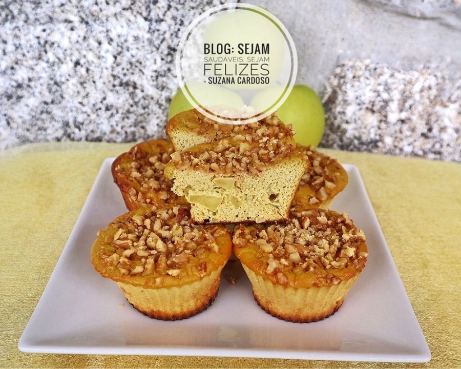 Olá miga, fiz estes queques hoje. , Ficaram uma delícia. Puz mais duas colheres de amêndoa, mais uma de linhaça, 4 ovos t. M, 3 maçãs, canela e aroma de baunilha. Decorei com maçã e nozes. É… Também puz uma banana que andava por aqui, já muito preta. Beijinhos