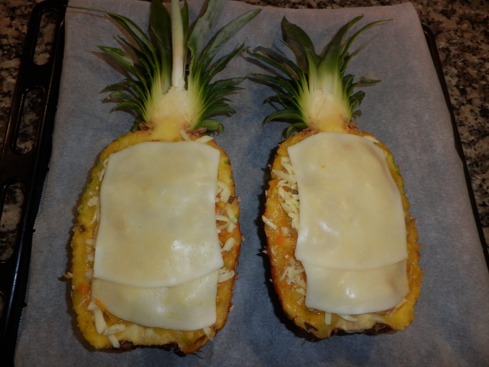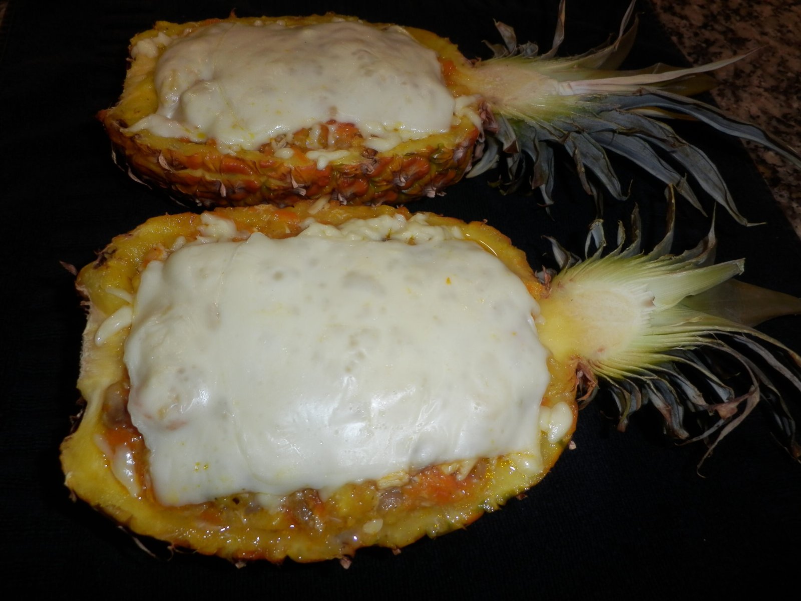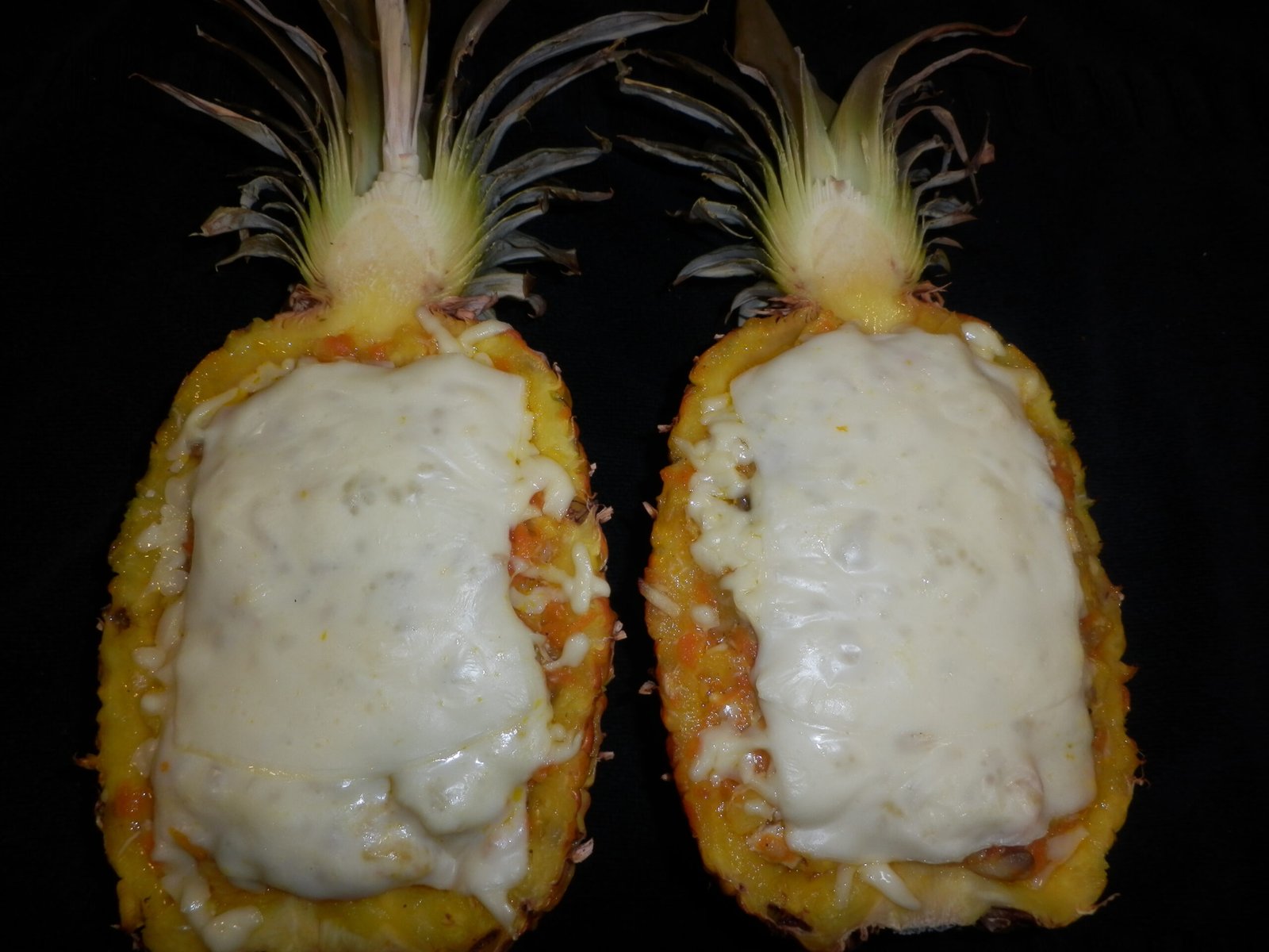 6º Passo: Rechear o ananás. Podem cobrir com queijo, se desejarem.
