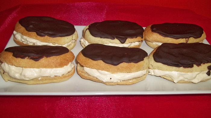 Coroados com chocolate negro, estes mini éclairs sem glúten e sem açúcar refinado são recheados com um creme, cujo sabor possui um toque especial a caramelo.