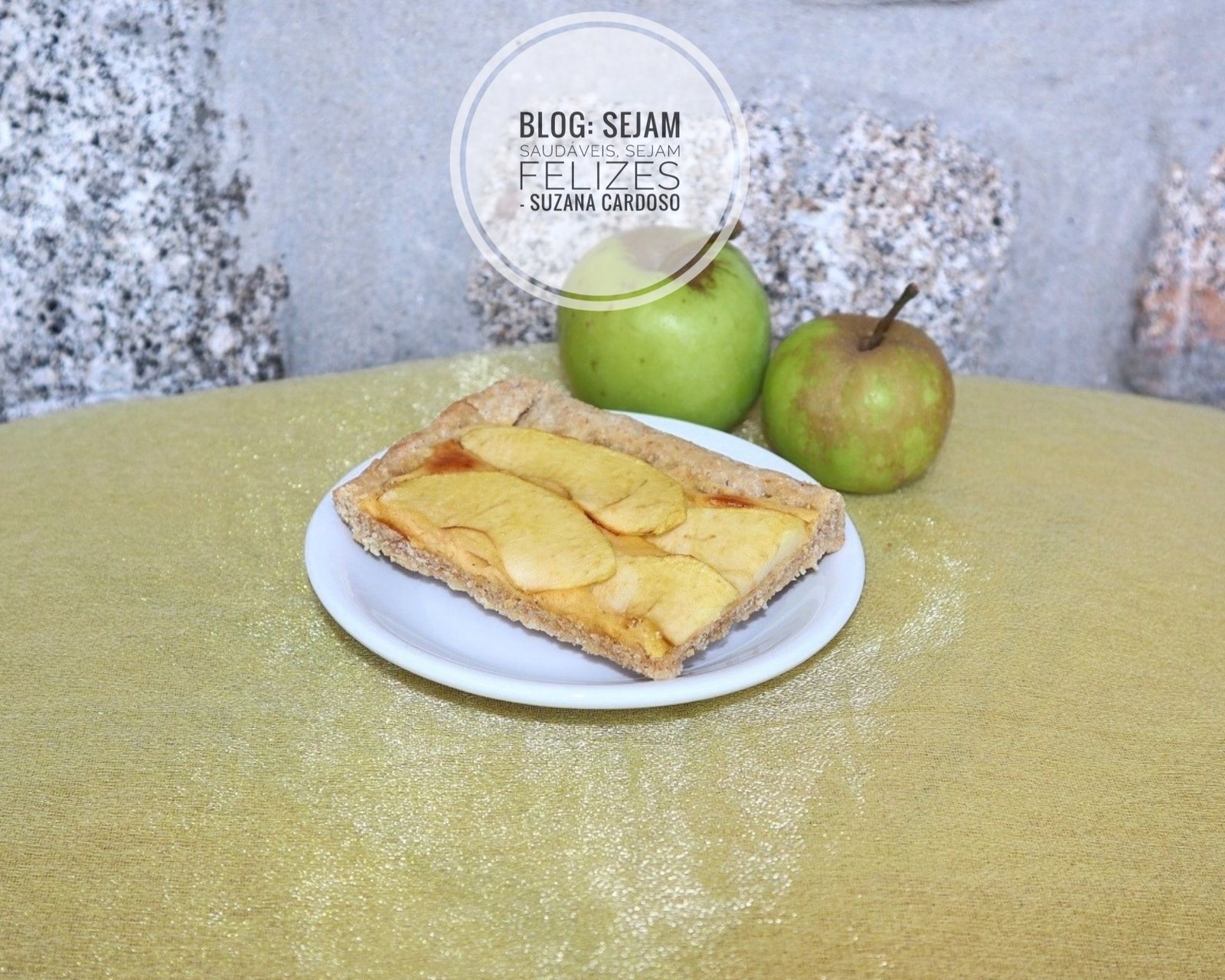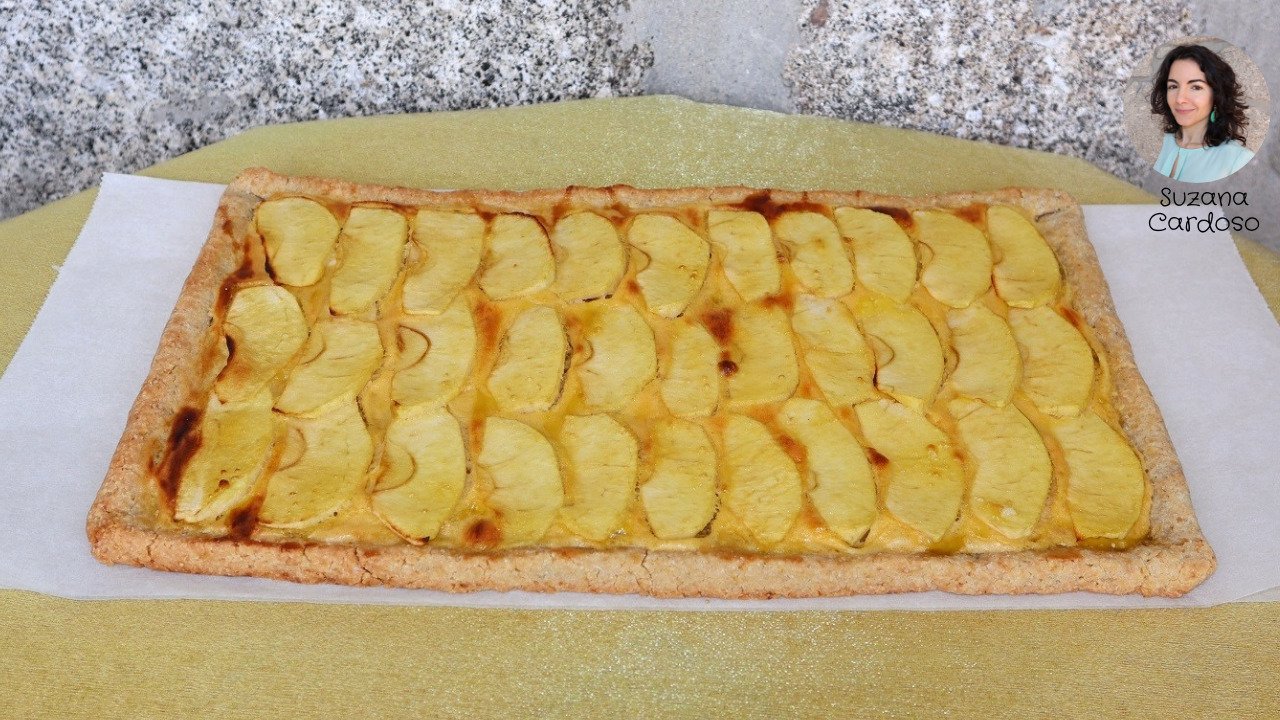 A base ficou crocante e saborosa, fazendo lembrar textura de bolacha. O creme delicado e pouco doce, tal como gostamos aqui por casa, conjugando harmoniosamente com a cobertura de maçãs laminadas, que poderá polvilhar com canela em pó. Experimente!