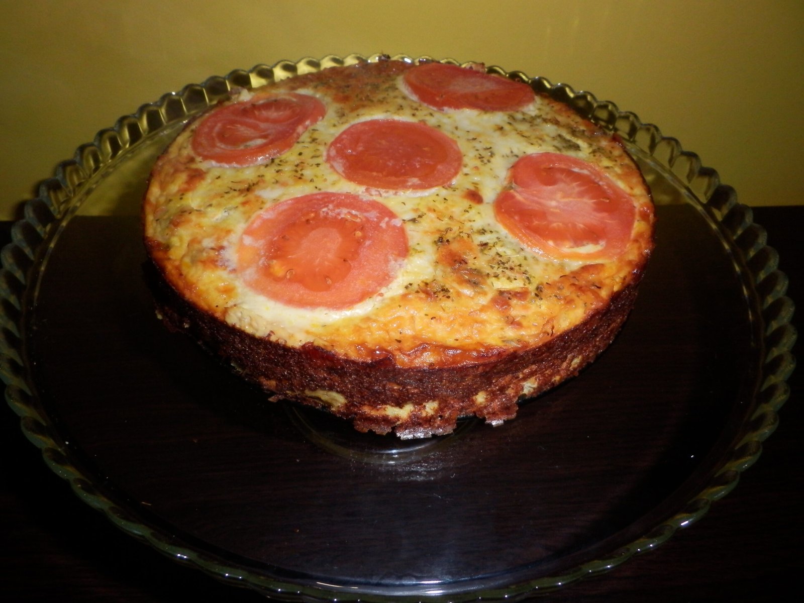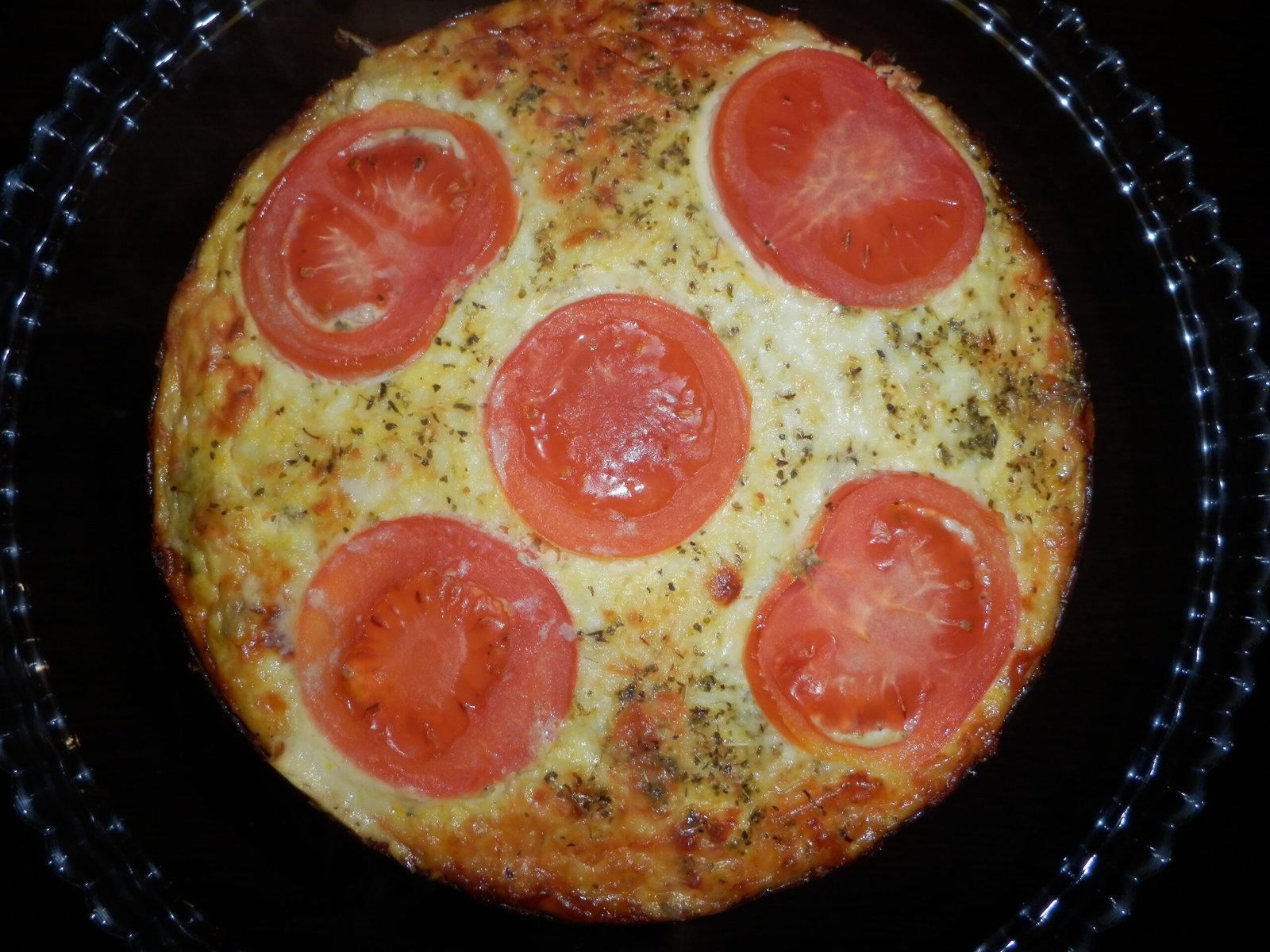 7. Untar a forma (com manteiga, azeite ou óleo de coco). Colocar o preparado na forma. Por cima, coloquei queijo ralado, rodelas de tomate e orégãos.